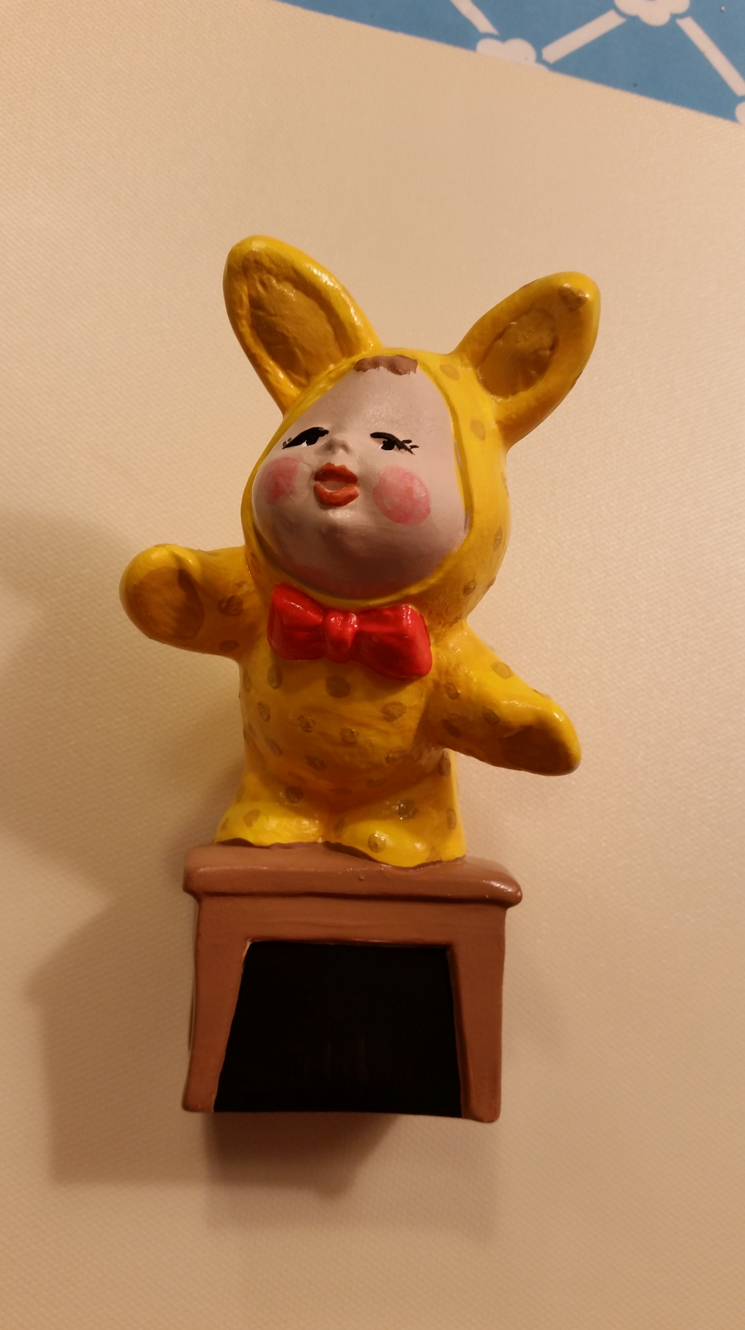 kid in bunny outfit on stool